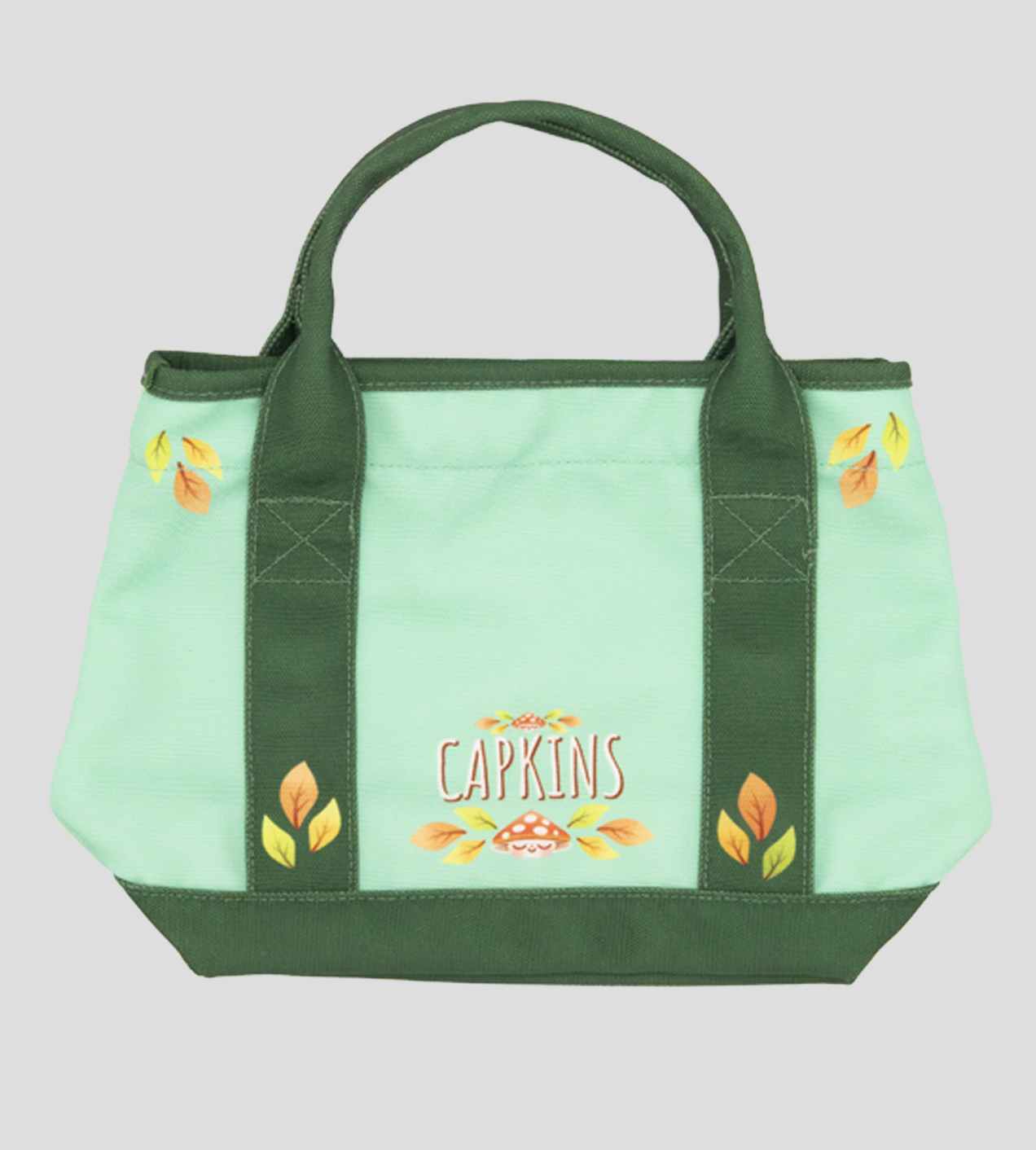 Bring all of your tiny essentials with you to the Fungi Forest in this Capkins mini tote bag! It's designed with two-tone green color-blocking and features Fly printed on the front drop pocket and autumnal leaves all over. Comes with carrying handles and a snap-button closure.