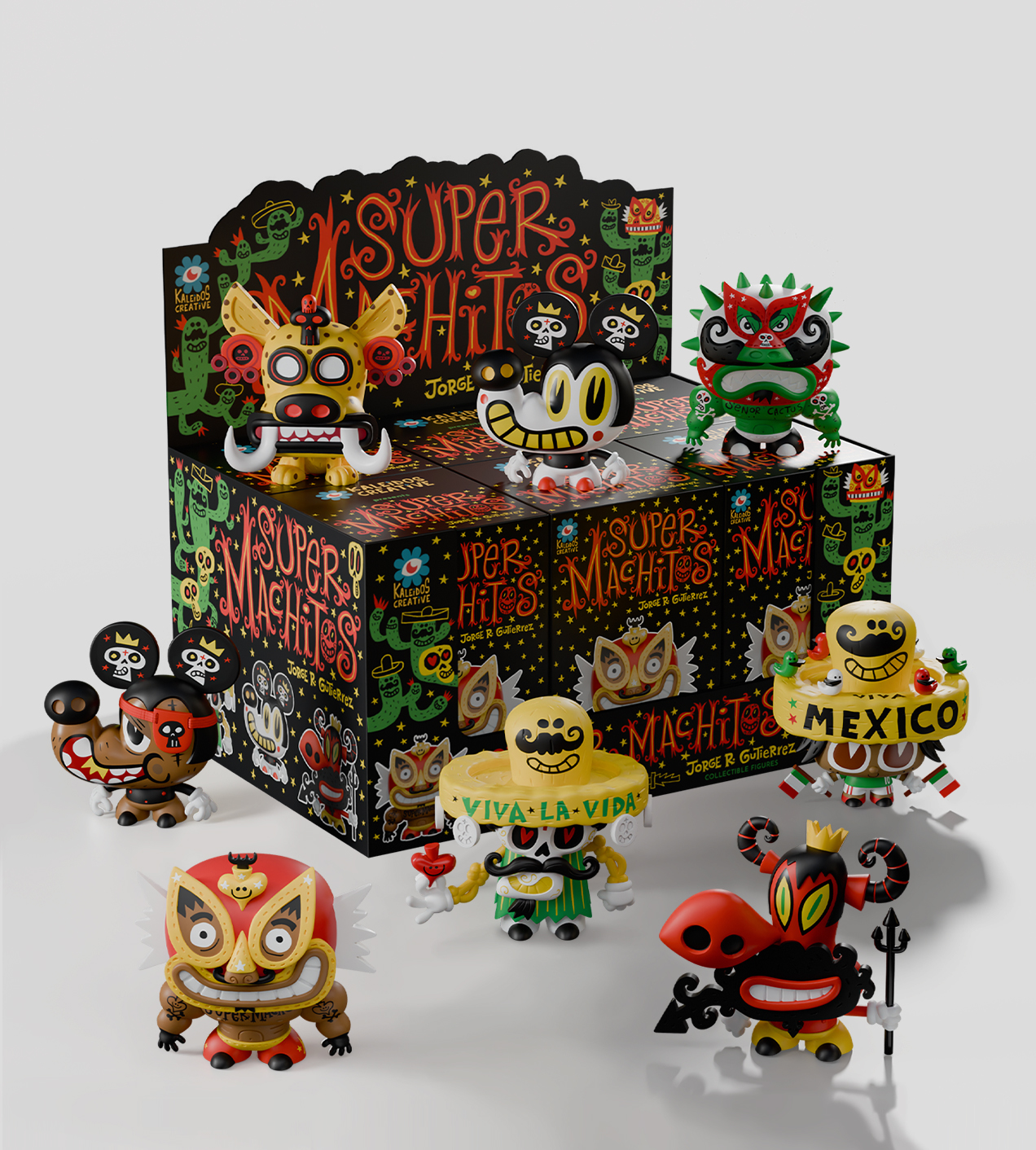 Behold the might of the Super Machitos! A fiery blind box set from award-winning Tijuana artist Jorge R. Gutierrez (El Tigre, The Book of Life, Maya and the Three). Each one-of-a-kind figure unleashes a new Mexploitation icon, born from Jorge’s over-the-top obsession with his beloved culture!